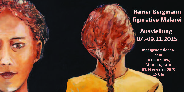 Vom 07.-09. November 2025 zeige ich im Mehrgenerationenhaus in Johannesberg figurative Gemälde, die in den letzten zwei Jahren entstanden sind. Die Arbeiten werden ergänzt mit Holzschnitten und Skulpturen. Die Besucherinnen und Besucher finden in erster Linie Arbeiten, die Menschen in spezifischen Szenarien zeigen und Fragen aufwerfen. Die Vernissage ist am Freitag, 07. November um 19 Uhr, die Ausstellung ist am Samstag und am Sonntag jeweils von 14 – 18 Uhr geöffnet.