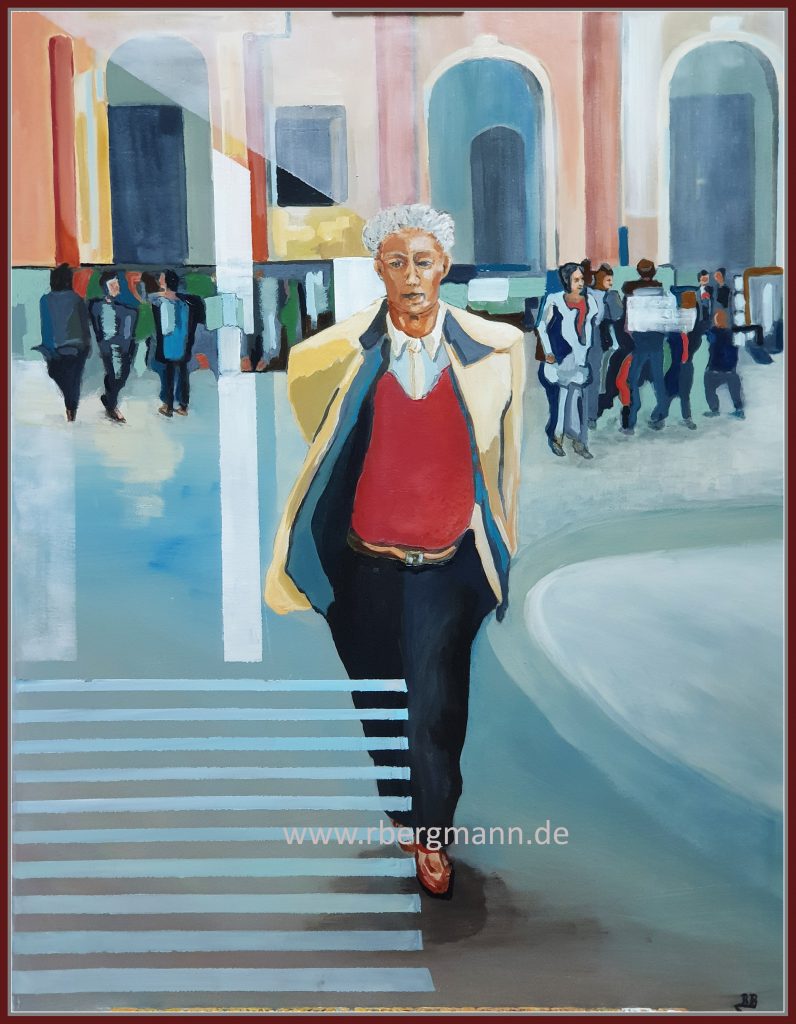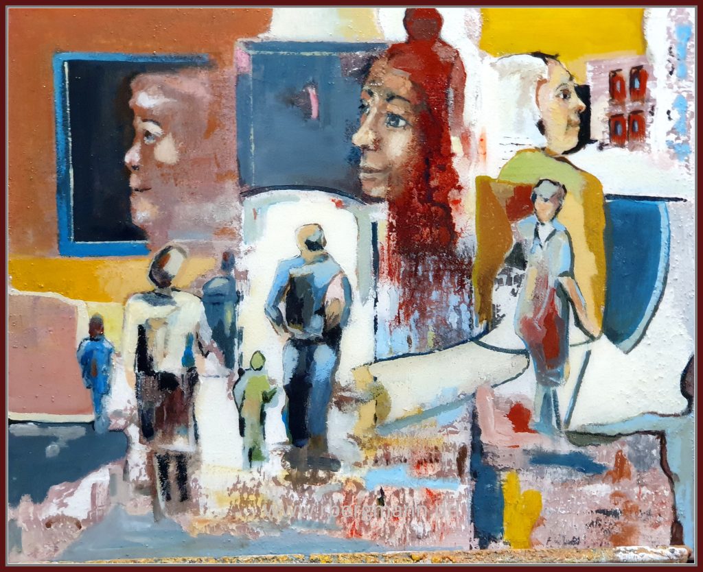 Seit 2014 arbeite ich an dieser Serie. Es ist immer noch spannend, Menschen in Beziehung zu sich selbst und dem sie umgebenden Raum zu malen. Dabei überlagern sich immer mehr Erinnerungen, Erfahrungen und sich ergebende Konstruktionen in einer Art Collage.